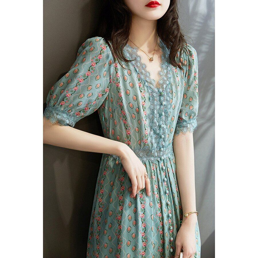 ワンピース レディース 40代 マキシワンピース 春夏新作 半袖ワンピース 花柄 レースVネック