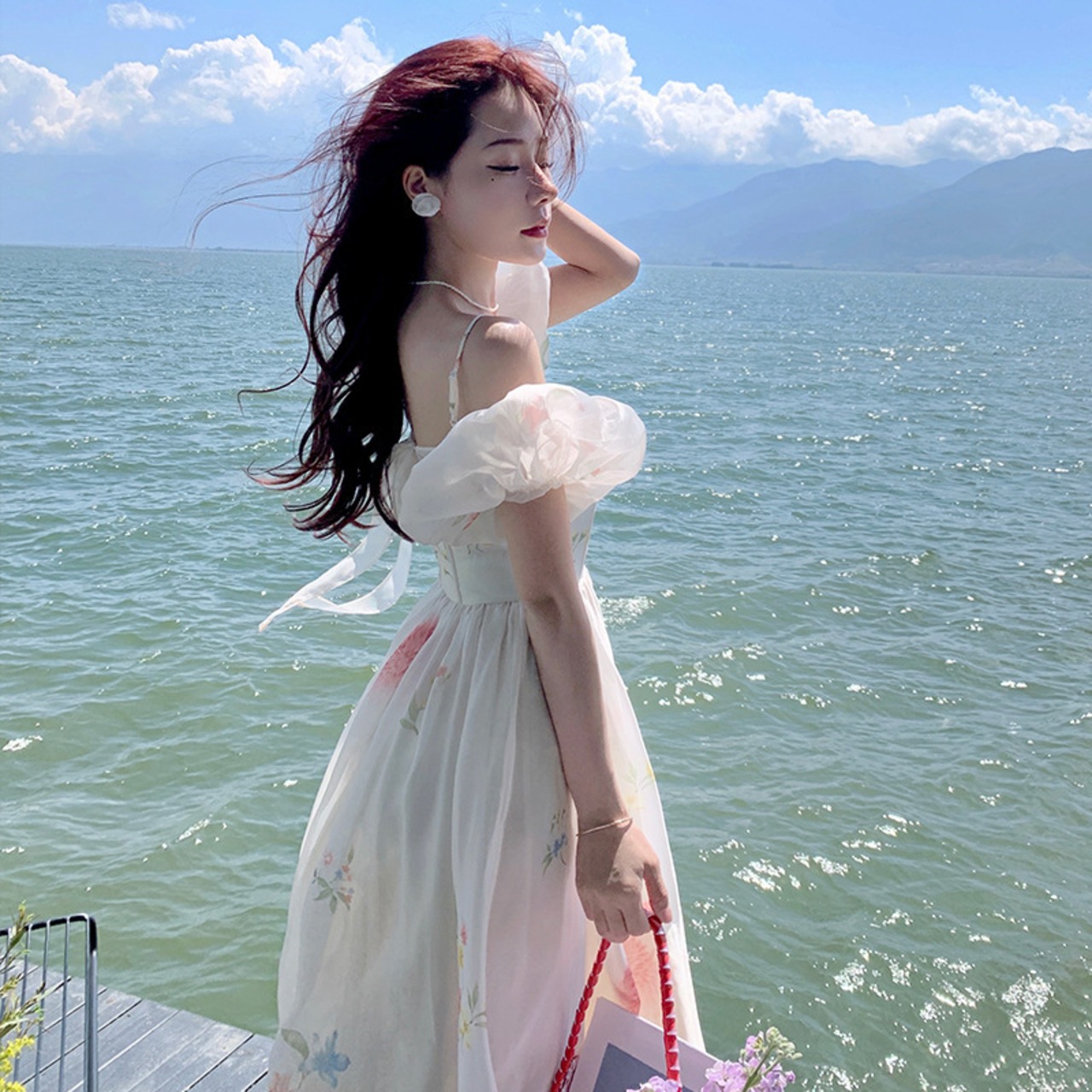 花柄ワンピース オフショルダー パフスリーブ キャミソールワンピース フレアワンピース ロングワンピ