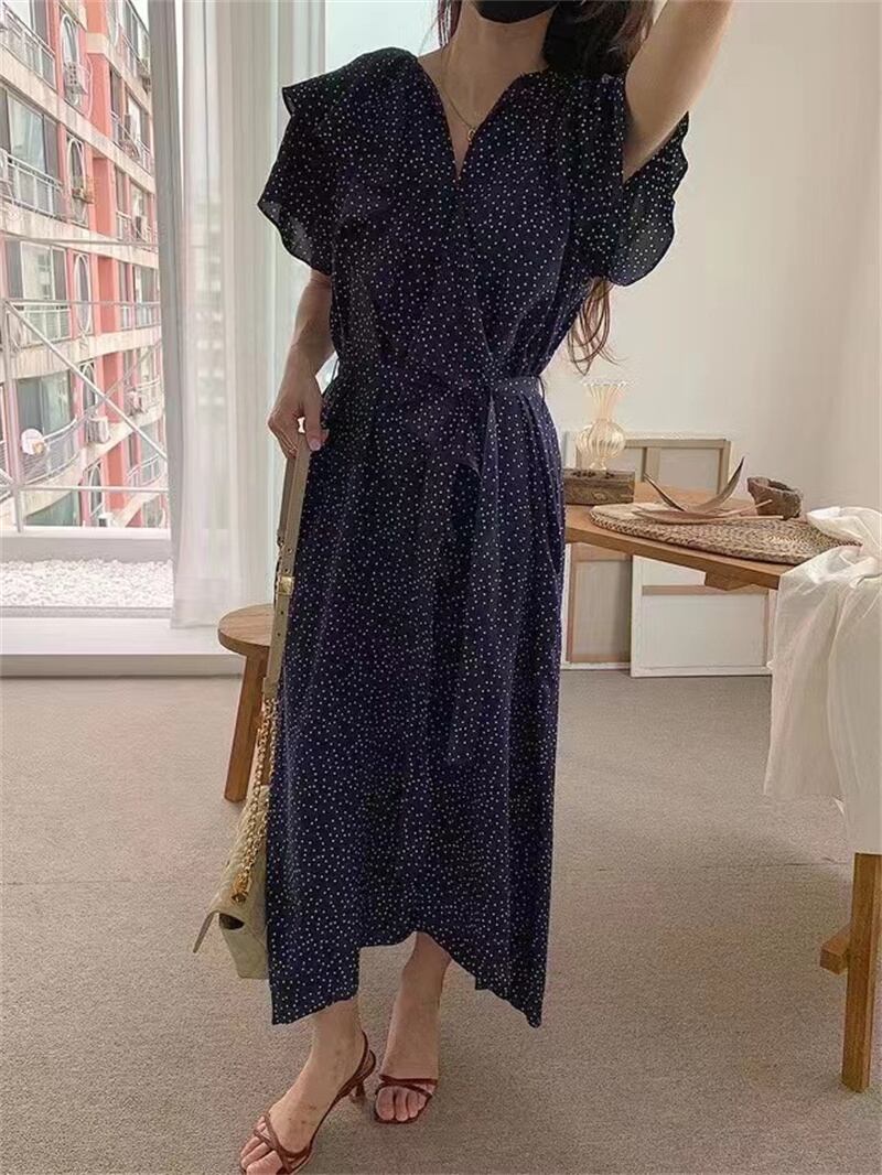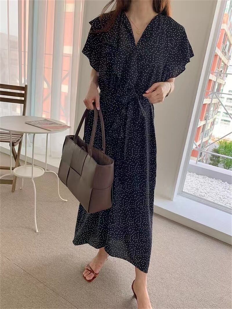 レトロ シフォン ドット柄 ロング カジュアルワンピース