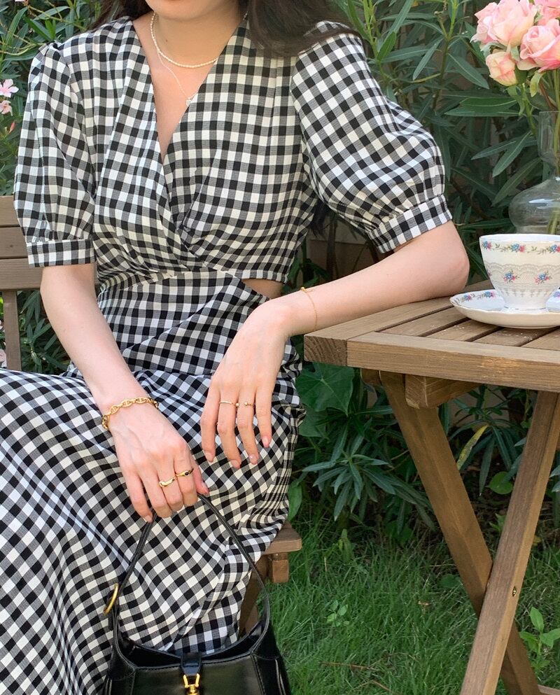 レトロ エレガント 透かし彫り 半袖 Vネック チェック柄 ロングワンピース