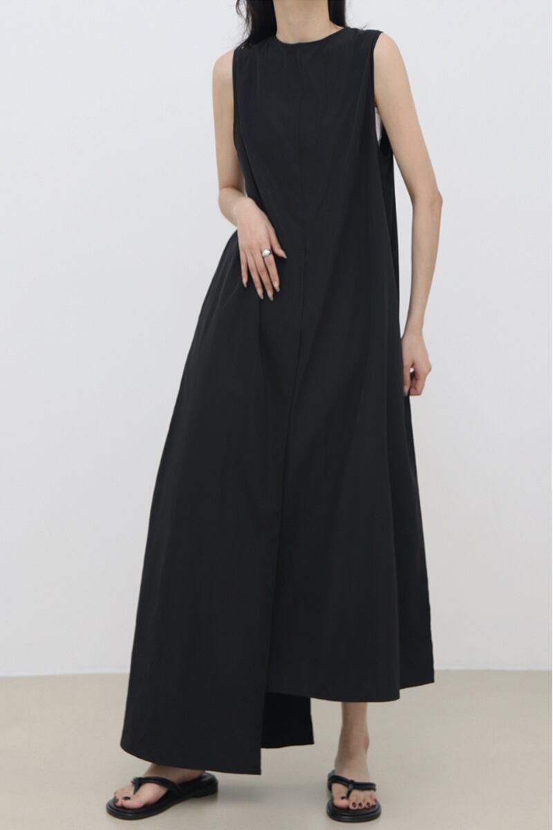 ゆったりノースリーブコットン無地 ロング ポケット キャミソールワンピース