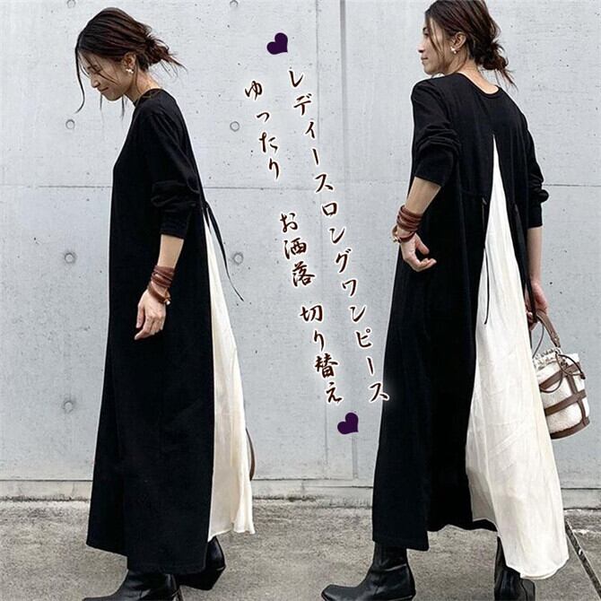 ワンピース レディース 長袖ワンピース 切り替え ブラック 春 ロングワンピース きれいめ 着痩せ