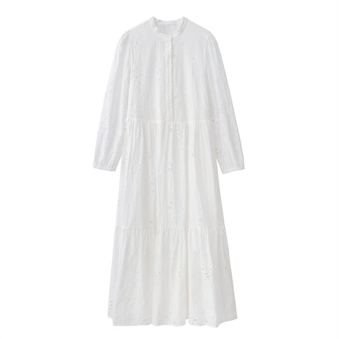 ゆったり透かし刺繍ワンピース長袖ワンピースロングワンピース