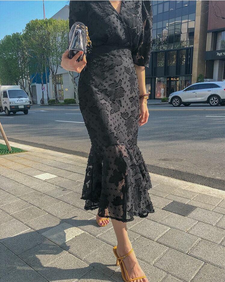 カシュクール ワンピース 黒 ミモレ丈ワンピース ロング Vネック 花柄ワンピース フィッシュテール
