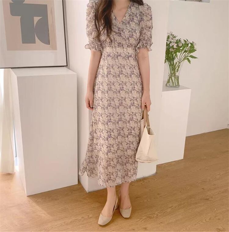 花柄 ジェントルスタイル スリム Vネック ロングスカート ワンピース